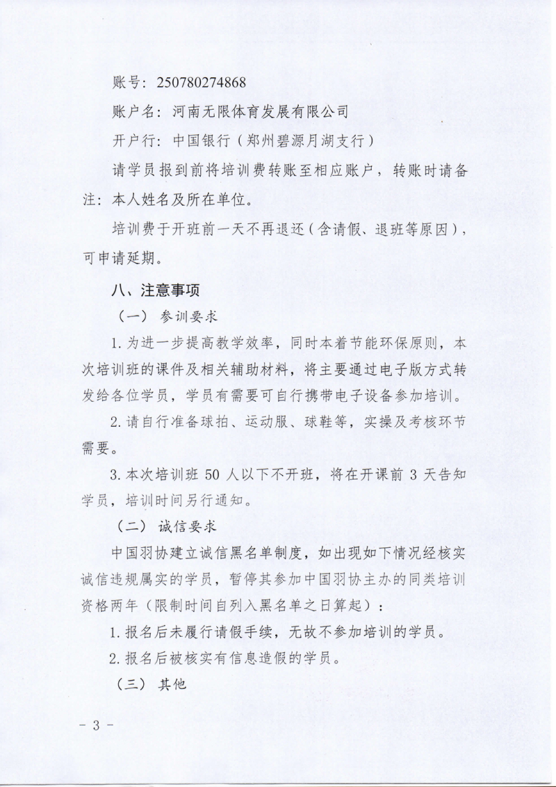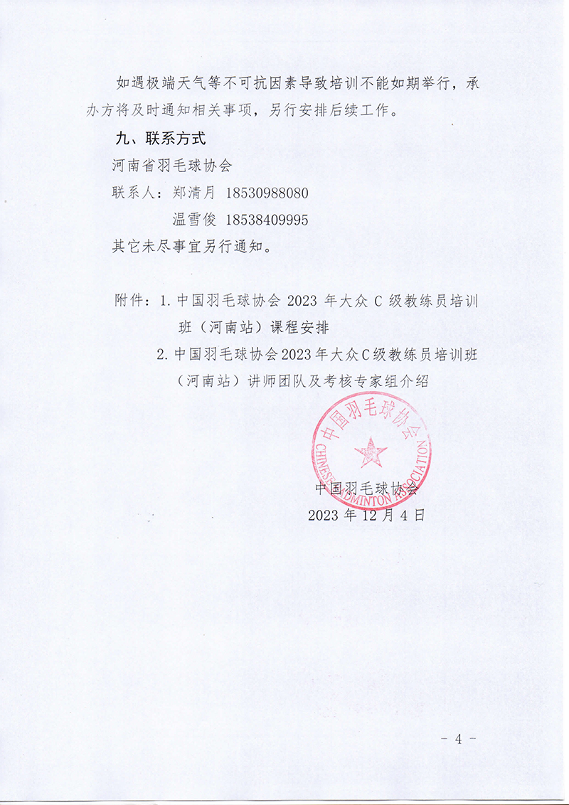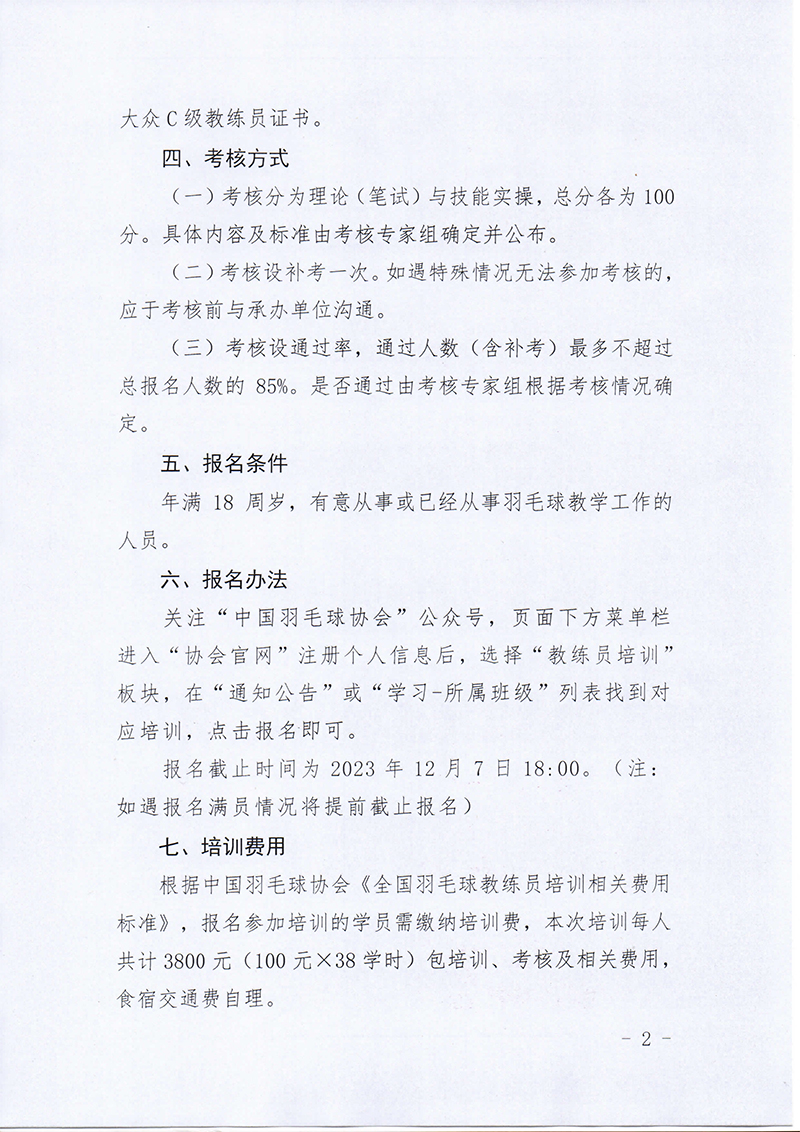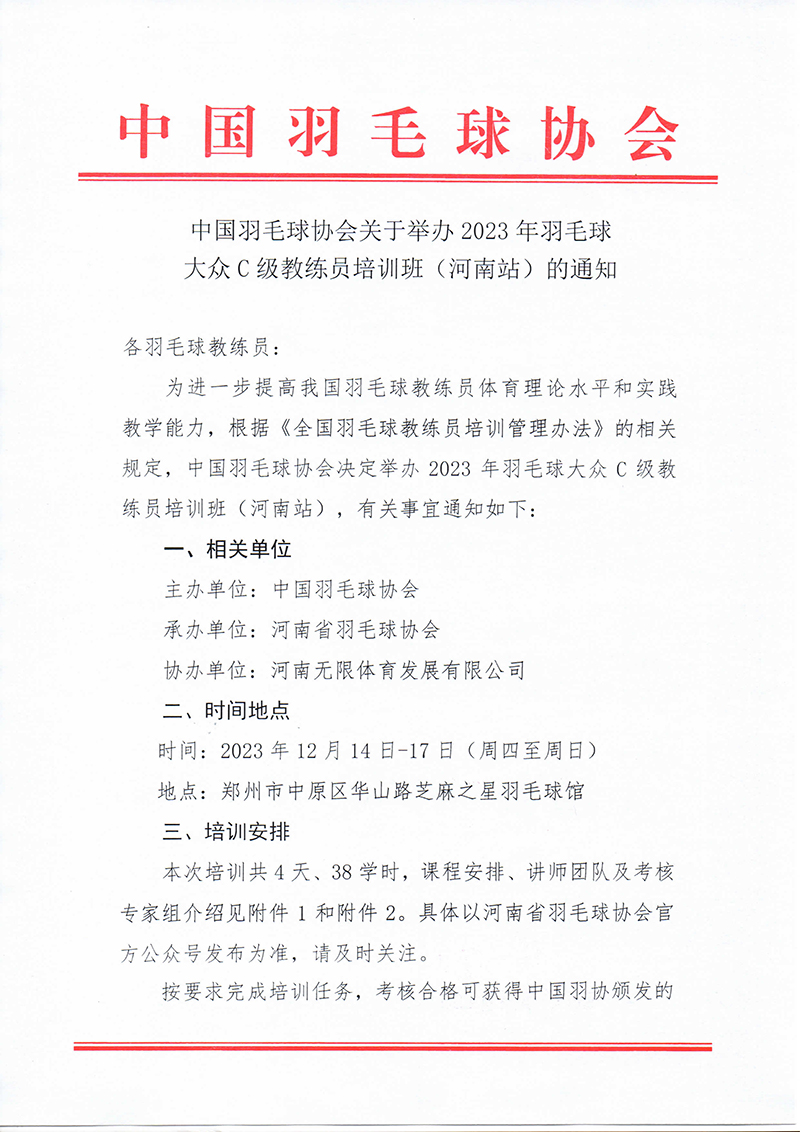 中国羽毛球协会关于举办2023年羽毛球大众C级教练员培训班(河南站)的通知