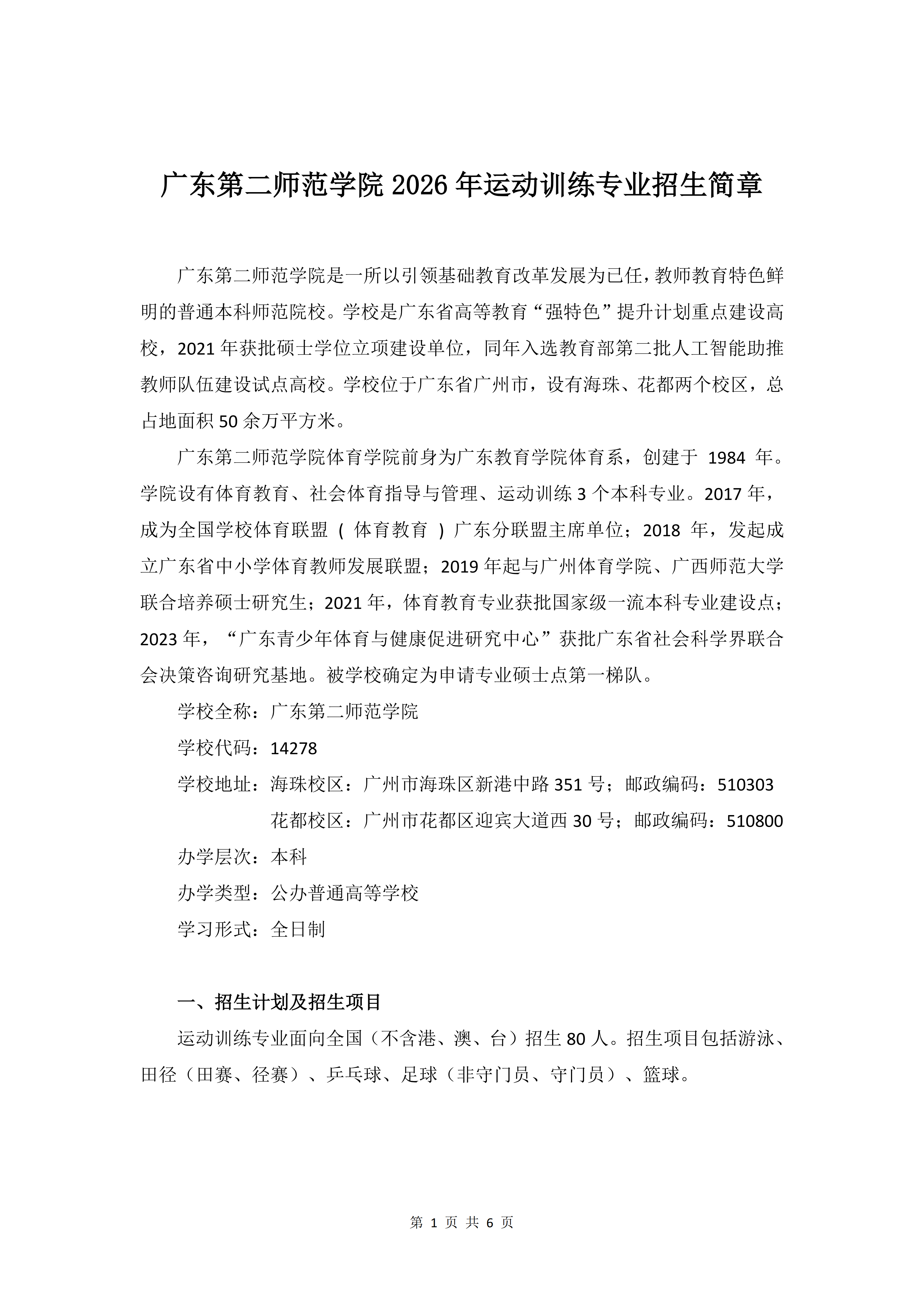 广东第二师范学院2026年运动训练专业招生简章