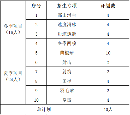(二)招生项目:高山滑雪、速度滑冰、短道速滑、冬季两项、曲棍球、射击、射箭、田径、羽毛球、拳击。