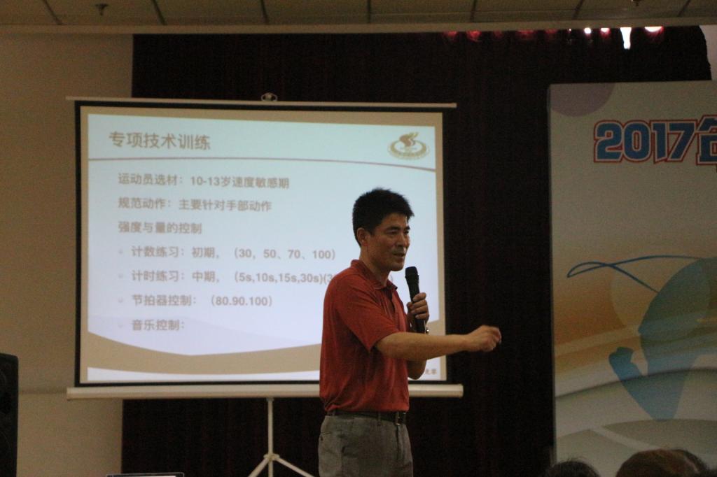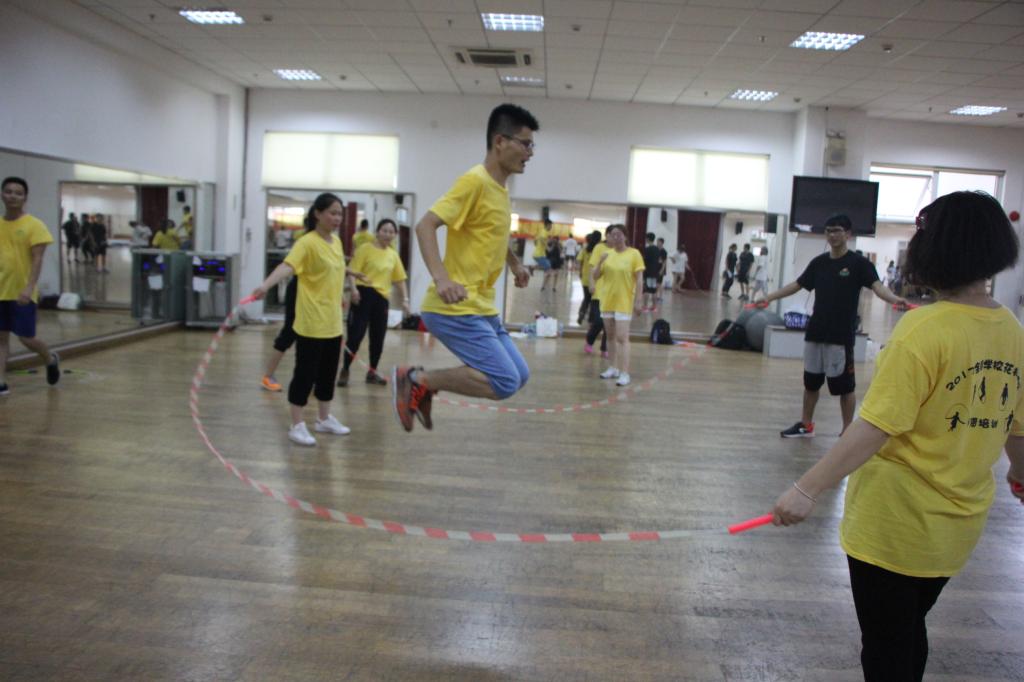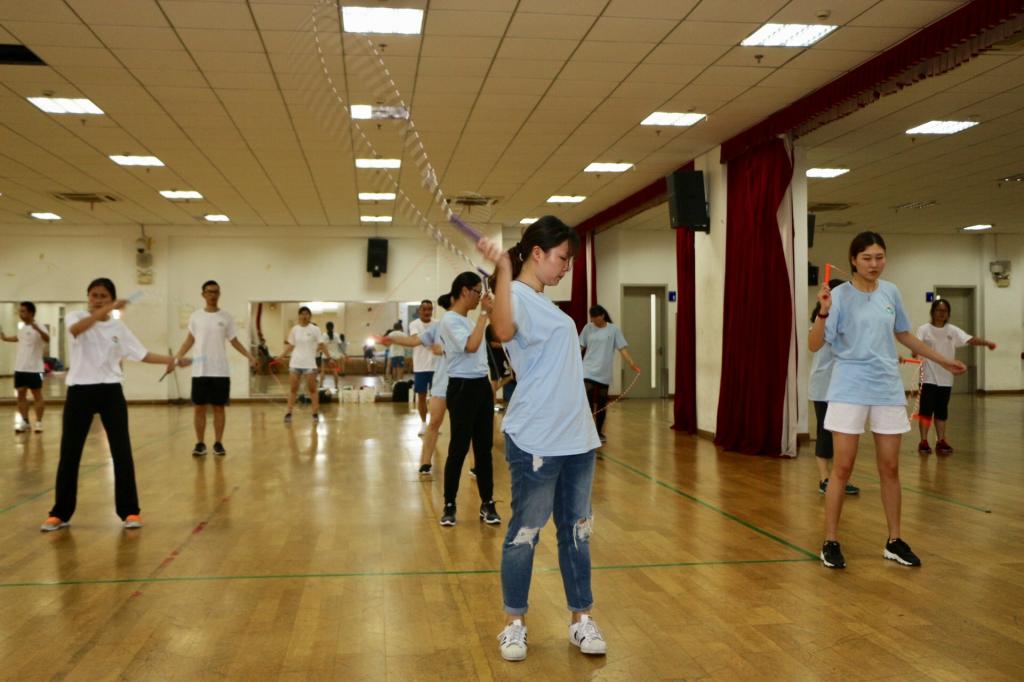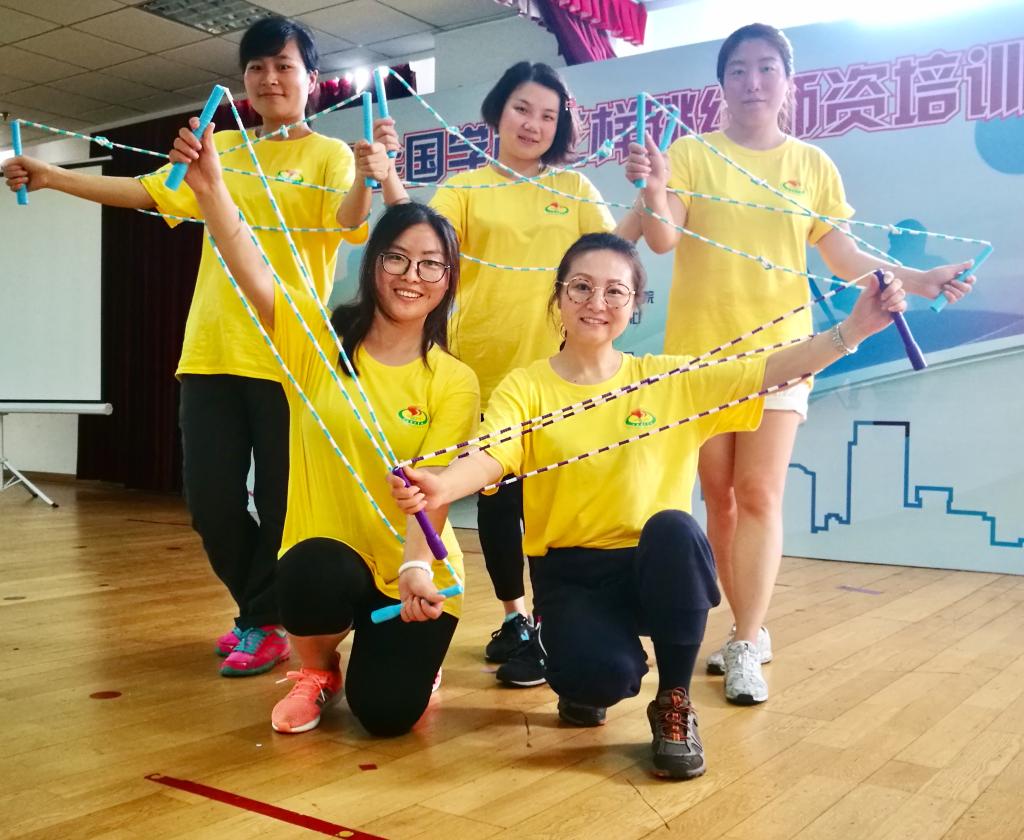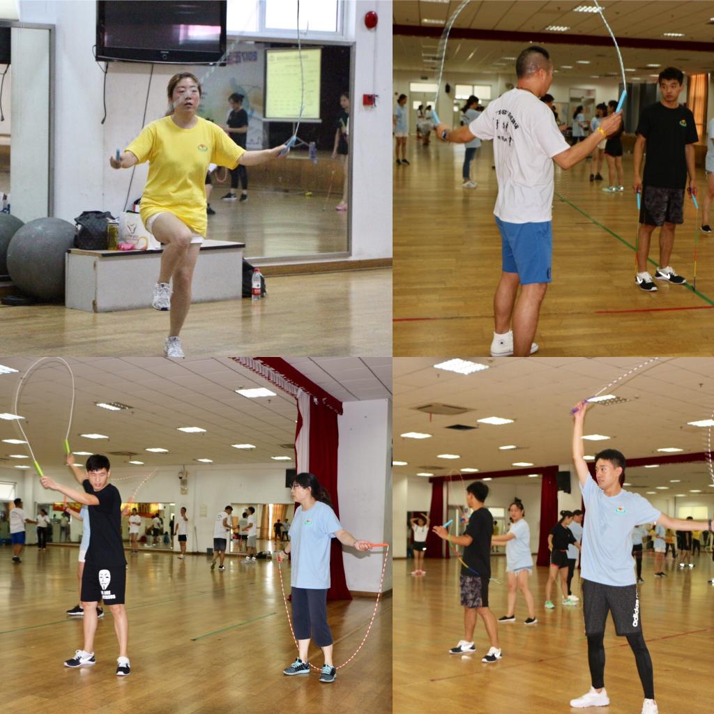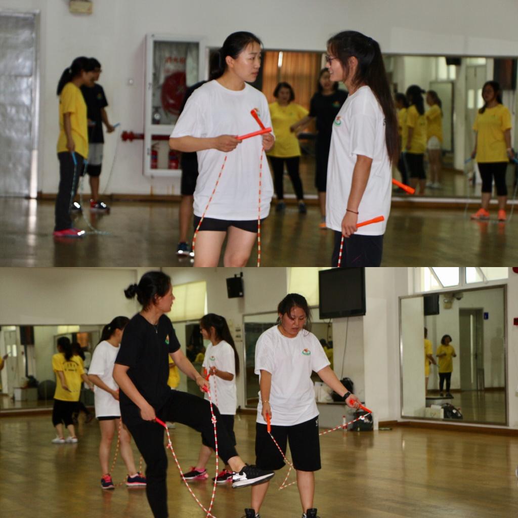 在开班仪式上,休艺学院刘明生书记详细讲述了我校花样跳绳的十年发展历程,介绍了我校花样跳绳在国内外竞赛、里约奥运会表演、课程建设等方面所取得的成绩,并分享理论课——跳绳速度训练方法。本次培训内容较为丰富,可操作性强,紧紧围绕校园跳绳的特点,准备了《校园跳绳强心计划实施方案》和《校园跳绳大课间实施指南》两套校园跳绳开展方案;课程设计中加入诸多创新元素,如以拓展训练的方式团建分班,以小组间挑战跳绳段位制来提升学习能力,以案例分享和现场观摩高水平花样跳绳展演的形式激发兴趣,以跳绳游戏拓展的形式倡导创新等。学员们在交流中相互启发、相互借鉴,共同提高,在轻松愉快的环境下学到了知识和技能。