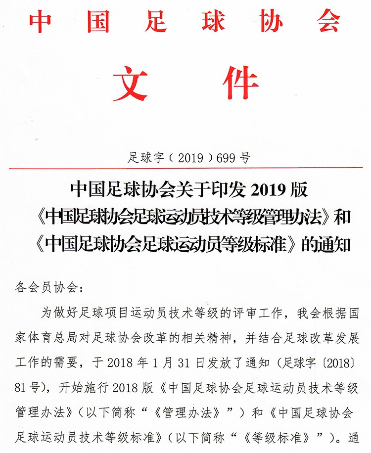 中国足协2019版足球运动员技术等级管理办法以及等级标准发布